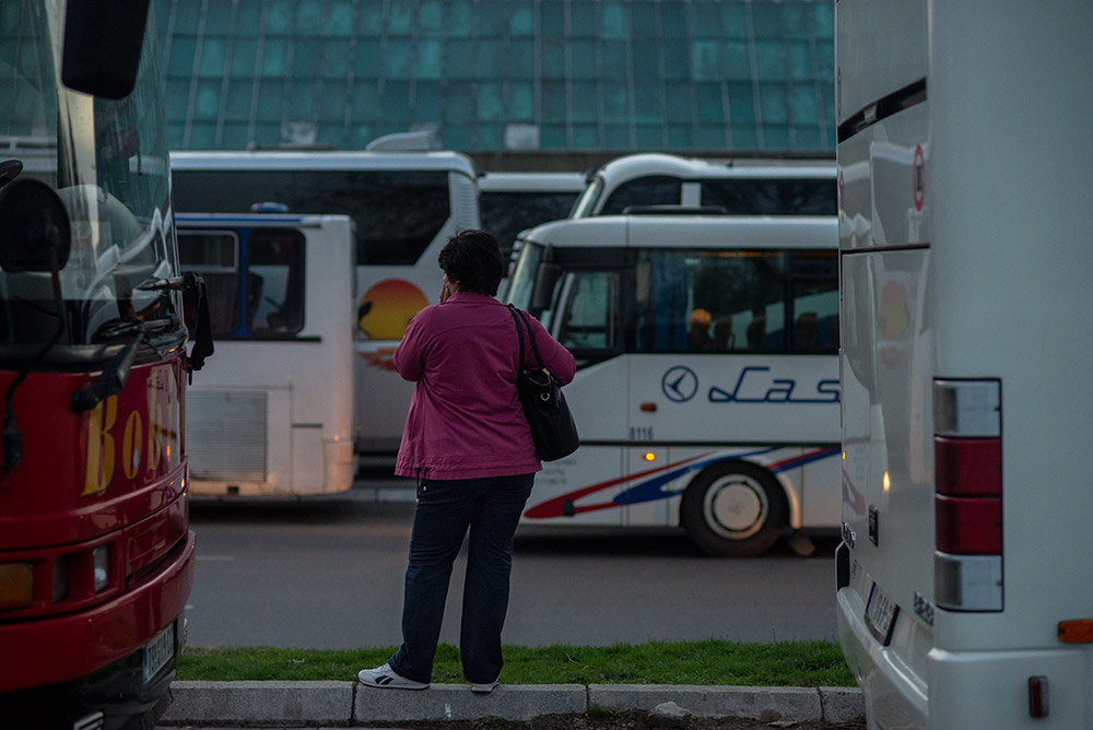 • A woman surrounded by busses that were transport attendees from different parts of the country to the campaign rally of the Serbian Progressive Party. Belgrade, Serbia, March 2017 © Milovan Milenković